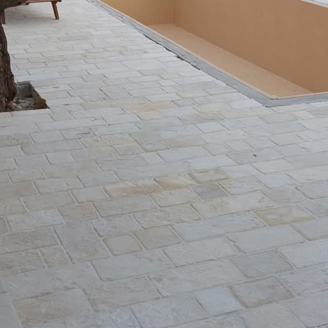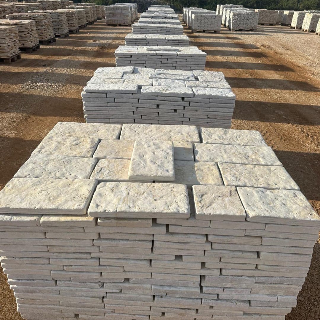Die MAESTRAL ANTIK Platte ist eine speziell bearbeitete Natursteinplatte, die durch Schneiden (Sägen) auf bestimmte Maße und anschließendes Trommeln (Bürsten) entsteht. Dieser Prozess entfernt scharfe Kanten und verleiht dem Stein eine glatte, leicht unregelmäßige Oberfläche mit einem antiken, rustikalen Charakter.
