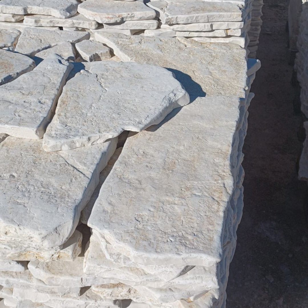 Die Antico Bruchplatte ist eine hochwertige Natursteinplatte, die durch eine spezielle Bearbeitung der klassischen Bruchplatten entsteht. Dieser Prozess, bekannt als „Trommelbearbeitung“ oder Sandstrahlung, entfernt scharfe Kanten und verleiht dem Stein eine weiche, gealterte Oberfläche, die an traditionelle mediterrane Bauwerke erinnert.
